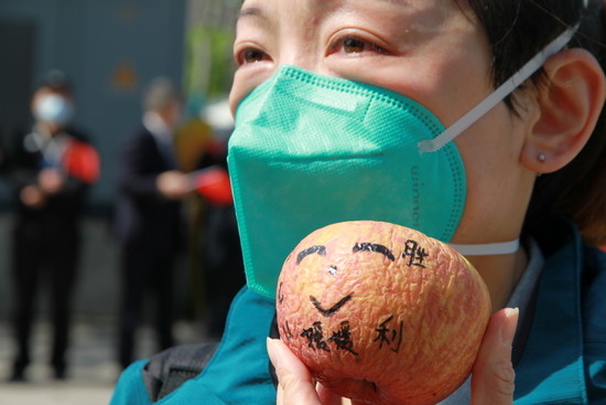 4月12日,北京協(xié)和醫(yī)療隊(duì)所負(fù)責(zé)的ICU患者清零,張媛媛松了一口氣,此時(shí)從北京帶來的蘋果已經(jīng)枯萎皺皮,她便在上面畫了一張笑臉,寫下“勝利”二字。她說,能夠把這個(gè)蘋果帶回家,意味著隊(duì)伍平安返京,而作為堅(jiān)守到最后的醫(yī)療隊(duì),她們的撤離標(biāo)志著武漢的抗疫工作獲得了重大階段性勝利。