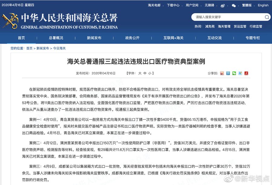 海關(guān)總署16日通報(bào)三起違法違規(guī)出口醫(yī)療物資典型案例,當(dāng)事人均涉嫌未向海關(guān)如實(shí)申報(bào),涉嫌逃避出口商品檢驗(yàn),受到立案調(diào)查或行政處罰。海關(guān)總署有關(guān)負(fù)責(zé)人表示,將采取多種聯(lián)合懲戒措施,讓違法者“一處失信,處處受限”。比如,企業(yè)被處罰的,海關(guān)將向商務(wù)主管部門通報(bào)企業(yè)被處罰信息,由其暫停企業(yè)的對外貿(mào)易經(jīng)營活動(dòng),海關(guān)根據(jù)商務(wù)主管部門的決定對該企業(yè)的進(jìn)出口貨物不予辦理報(bào)關(guān)驗(yàn)放。(記者劉紅霞)