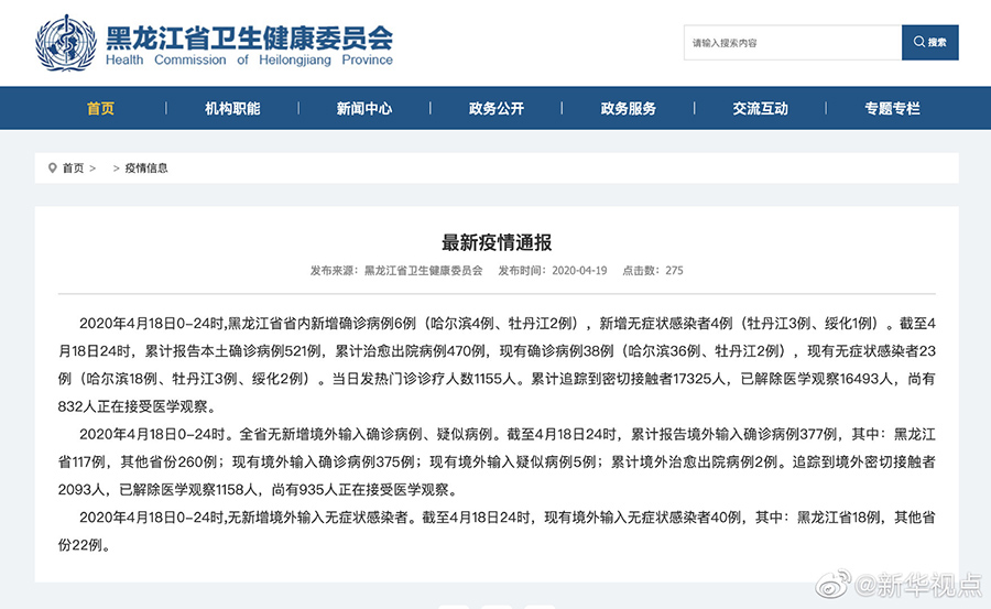2020年4月18日0-24時,黑龍江省省內(nèi)新增確診病例6例(哈爾濱4例、牡丹江2例),新增無癥狀感染者4例(牡丹江3例、綏化1例)。截至4月18日24時,累計報告本土確診病例521例,累計治愈出院病例470例,現(xiàn)有確診病例38例(哈爾濱36例、牡丹江2例),現(xiàn)有無癥狀感染者23例(哈爾濱18例、牡丹江3例、綏化2例)。當(dāng)日發(fā)熱門診診療人數(shù)1155人。累計追蹤到密切接觸者17325人,已解除醫(yī)學(xué)觀察16493人,尚有832人正在接受醫(yī)學(xué)觀察。