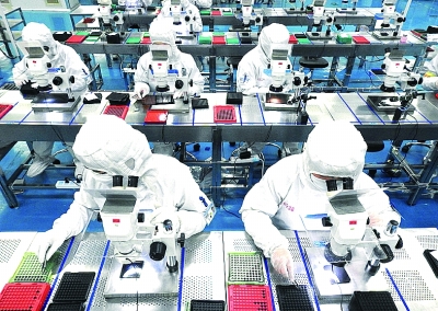 江蘇連云港海州經(jīng)濟(jì)開(kāi)發(fā)區(qū)內(nèi)一公司,工人正在加緊生產(chǎn)一批海外企業(yè)配套的手機(jī)攝像頭產(chǎn)品。耿玉和攝/光明圖片