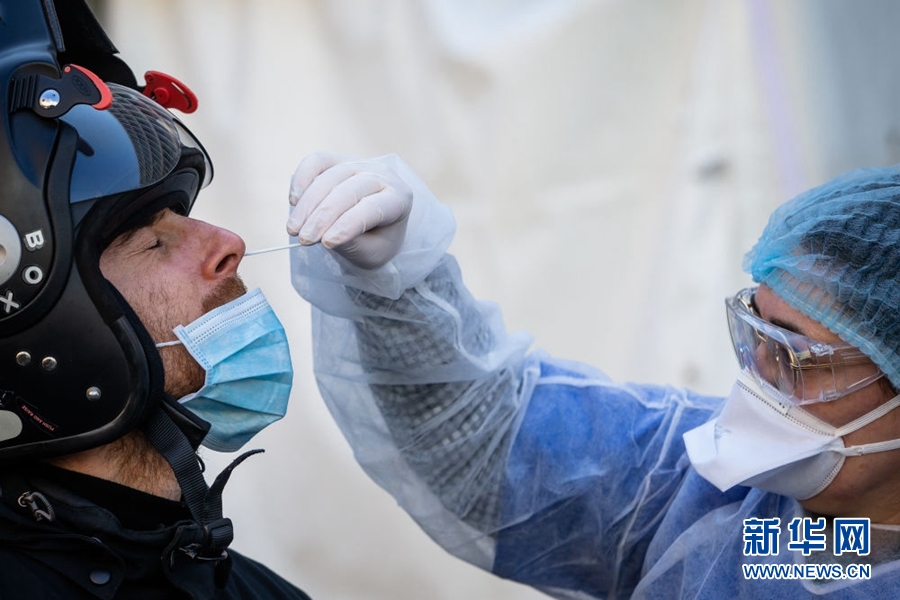 4月1日,在法國巴黎17區(qū),工作人員為一名接受新冠病毒檢測的醫(yī)護(hù)人員取樣。新華社發(fā)(奧雷利安·莫里薩爾攝)