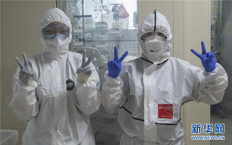 3月18日,在韓國大邱啟明大學(xué)東山醫(yī)院,醫(yī)護(hù)人員對記者擺出勝利手勢。新華社發(fā)(李相浩攝)