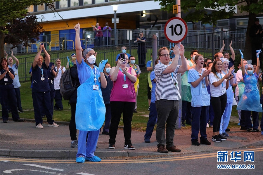4月23日,在英國雷丁,皇家伯克郡醫(yī)院的醫(yī)護(hù)人員在醫(yī)院外鼓掌。新冠疫情暴發(fā)以來,每周四晚八時(shí),英國人在陽臺、門前或窗前鼓掌,向醫(yī)護(hù)人員致敬。部分醫(yī)院的醫(yī)護(hù)人員也忙里偷閑走出醫(yī)院,感謝人們的支持,也為自己鼓掌加油。新華社發(fā)(蒂姆·愛爾蘭攝)