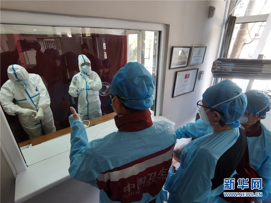 4月11日,在塞爾維亞首都貝爾格萊德,中國赴塞爾維亞抗疫醫(yī)療專家組在貝爾格萊德一所門診走訪,為醫(yī)護(hù)人員的防護(hù)意識點(diǎn)贊。新華社發(fā)(中國赴塞爾維亞抗疫醫(yī)療專家組供圖)