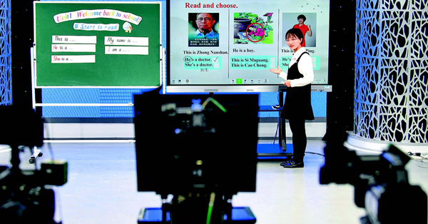 2月17日,寧夏銀川市金鳳區(qū)實(shí)驗(yàn)小學(xué)教師楊玉燕在錄制“空中課堂”四年級(jí)英語(yǔ)課程 馮開(kāi)華攝