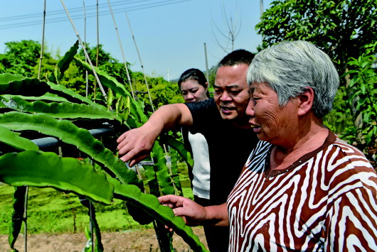 4月26日,廈門海滄青礁村院前社理事長陳俊雄(中)在指導村民種植火龍果。 照片均由本報記者魏培全拍攝