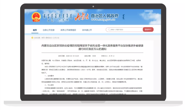 內(nèi)蒙古自治區(qū)以規(guī)范和簡(jiǎn)化健康通行碼辦理、方便群眾生產(chǎn)生活、促進(jìn)人員有序流動(dòng)為目的,以互聯(lián)網(wǎng)、大數(shù)據(jù)為支撐,依托全國(guó)一體化政務(wù)服務(wù)平臺(tái),建立省際防疫健康通行碼互認(rèn)機(jī)制,居民在當(dāng)?shù)厣觐I(lǐng)的健康通行碼,在建立互認(rèn)機(jī)制的?。▍^(qū)、市)之間互認(rèn),出行時(shí)無(wú)需重復(fù)申領(lǐng)。