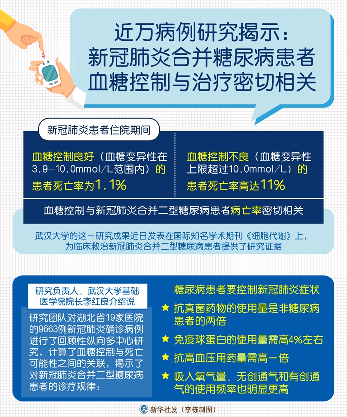 研究負(fù)責(zé)人、武漢大學(xué)基礎(chǔ)醫(yī)學(xué)院院長李紅良介紹說,研究團(tuán)隊(duì)對(duì)湖北省19家醫(yī)院的9663例新冠肺炎確診病例進(jìn)行了回顧性縱向多中心研究,計(jì)算了血糖控制與死亡可能性之間的關(guān)聯(lián),揭示了對(duì)新冠肺炎合并二型糖尿病患者的診療規(guī)律:糖尿病患者要控制新冠肺炎癥狀,抗真菌藥物的使用量是非糖尿病患者的兩倍,免疫球蛋白的使用量需高4%左右,抗高血壓用藥量需高一倍,吸入氧氣量、無創(chuàng)通氣和有創(chuàng)通氣的使用頻率也明顯更高。