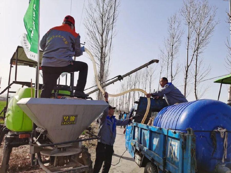 農(nóng)機(jī)手接單后,前往農(nóng)田進(jìn)行農(nóng)業(yè)勞務(wù)服務(wù)。圖為給自走式噴霧機(jī)加注“除草劑” 李虎威 攝
