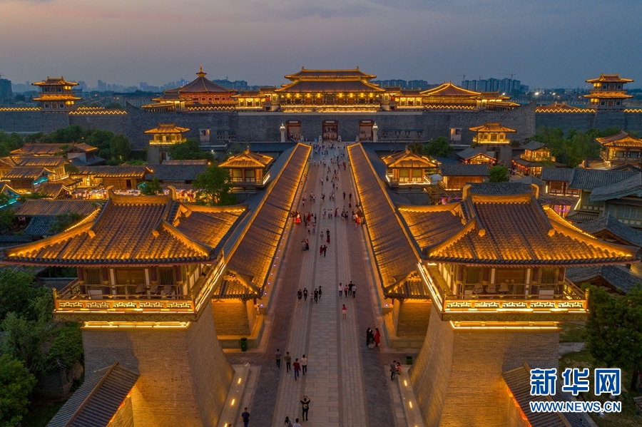 5月1日,游客在湖北省襄陽(yáng)市唐城景區(qū)觀賞夜景(無(wú)人機(jī)照片)。 新華社發(fā)(楊東 攝)