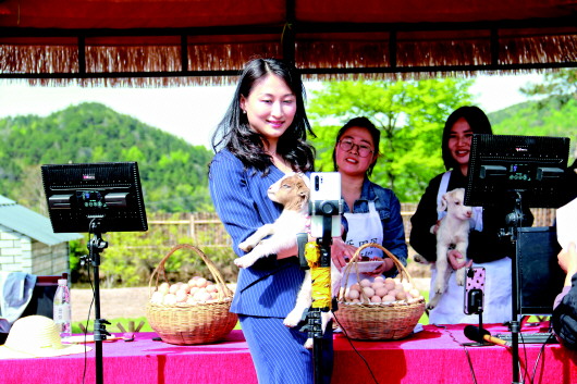 4月7日,在安徽香茗山的喜樂田園農(nóng)場(chǎng),太湖縣副縣長(zhǎng)唐翔與網(wǎng)友互動(dòng)。 受訪者供圖