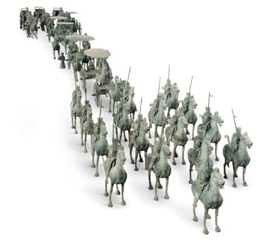 圖為武威雷臺(tái)漢墓的銅車馬武士?jī)x仗俑。
