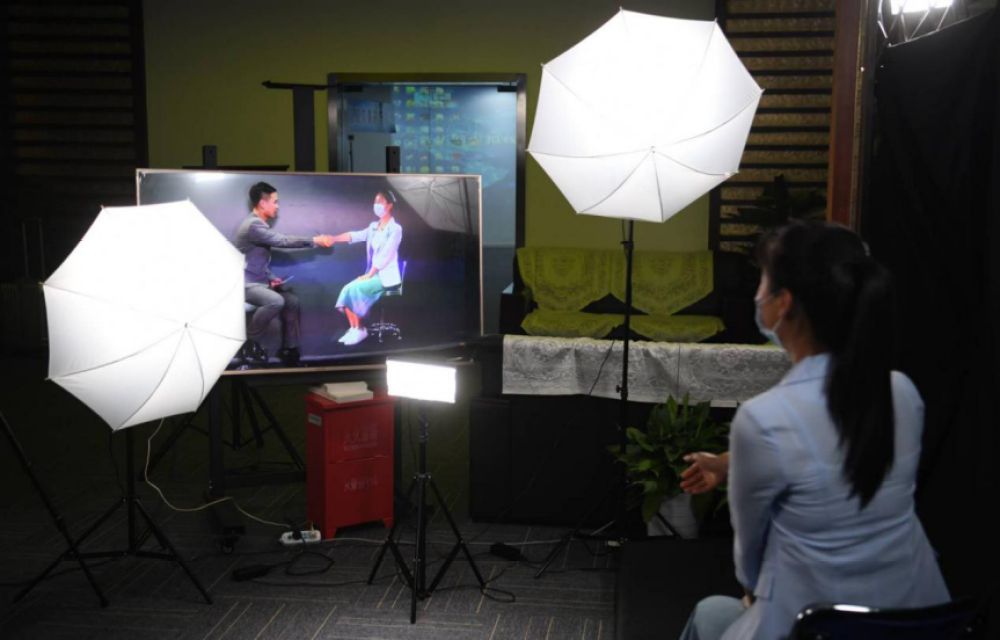 ↑本場訪談是新華社首次采用5G傳輸加全息成像技術(shù)進行采訪,使全國人大代表和主持人即使相隔千里也能實現(xiàn)“面對面”的交流。這是全國人大代表程桔在武漢演播室伸手,與北京的主持人高熹“云握手”。新華社記者 程敏 攝