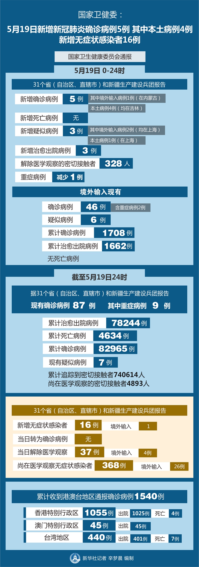 截至5月19日24時(shí),據(jù)31個(gè)?。ㄗ灾螀^(qū)、直轄市)和新疆生產(chǎn)建設(shè)兵團(tuán)報(bào)告,現(xiàn)有確診病例87例(其中重癥病例9例),累計(jì)治愈出院病例78244例,累計(jì)死亡病例4634例,累計(jì)報(bào)告確診病例82965例,現(xiàn)有疑似病例7例。累計(jì)追蹤到密切接觸者740614人,尚在醫(yī)學(xué)觀(guān)察的密切接觸者4893人。