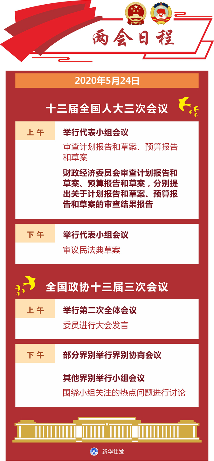 新華社北京5月23日電? 24日上午,十三屆全國人大三次會議舉行代表小組會議,審查計劃報告和草案、預(yù)算報告和草案;財政經(jīng)濟(jì)委員會審查計劃報告和草案、預(yù)算報告和草案,分別提出關(guān)于計劃報告和草案、預(yù)算報告和草案的審查結(jié)果報告。下午舉行代表小組會議,審議民法典草案。