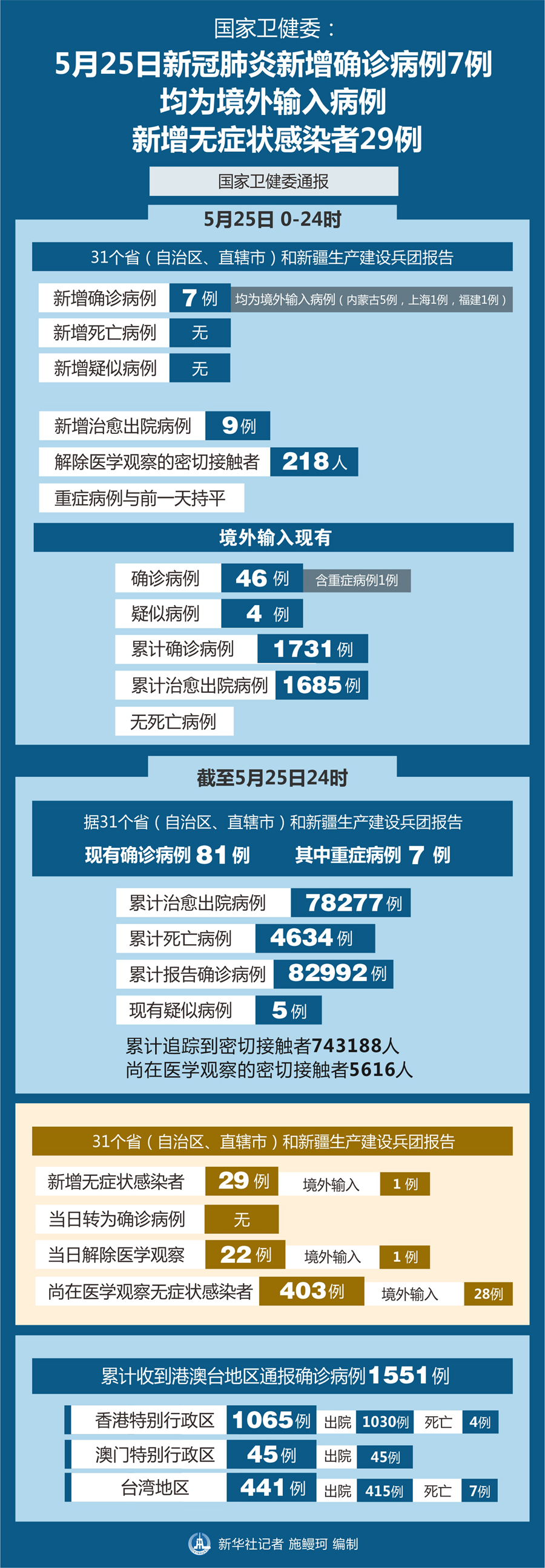 截至5月25日24時(shí),據(jù)31個(gè)省(自治區(qū)、直轄市)和新疆生產(chǎn)建設(shè)兵團(tuán)報(bào)告,現(xiàn)有確診病例81例(其中重癥病例7例),累計(jì)治愈出院病例78277例,累計(jì)死亡病例4634例,累計(jì)報(bào)告確診病例82992例,現(xiàn)有疑似病例5例。累計(jì)追蹤到密切接觸者743188人,尚在醫(yī)學(xué)觀察的密切接觸者5616人。