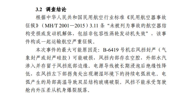 調(diào)查報告顯示,本次事件的最大可能原因是:B-6419號機右風(fēng)擋封嚴(yán)(氣象封嚴(yán)或封嚴(yán)硅膠)可能破損,風(fēng)擋內(nèi)部存在空腔,外部水汽滲入并存留于風(fēng)擋底部邊緣。電源導(dǎo)線被長期浸泡后絕緣性降低,在風(fēng)擋左下部拐角處出現(xiàn)潮濕環(huán)境下的持續(xù)電弧放電。電弧產(chǎn)生的局部高溫導(dǎo)致雙層結(jié)構(gòu)玻璃破裂。風(fēng)擋不能承受駕駛艙內(nèi)外壓差從機身爆裂脫落。