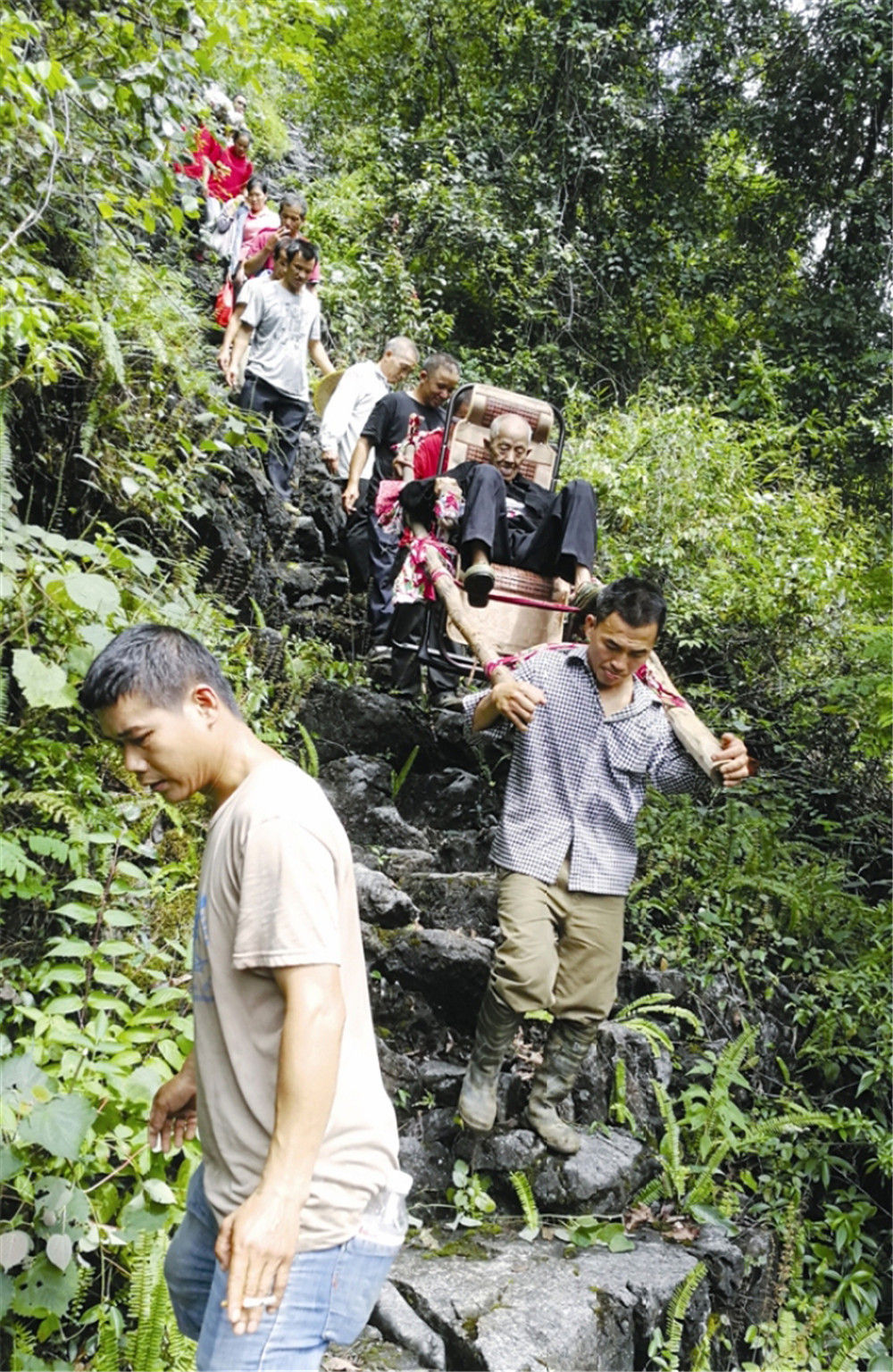 在廣西環(huán)江毛南族自治縣下南鄉(xiāng)下塘村,當?shù)馗刹咳罕妼⒆T運日老人抬下山(2019年9月11日攝)。新華社發(fā)(譚召關(guān) 攝)