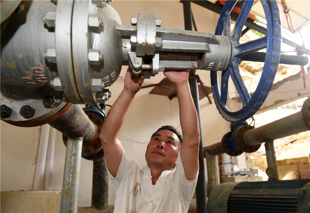 在廣西環(huán)江毛南族自治縣下南鄉(xiāng)抽水站,工作人員在檢查設備(5月22日攝)。新華社記者 陸波岸 攝