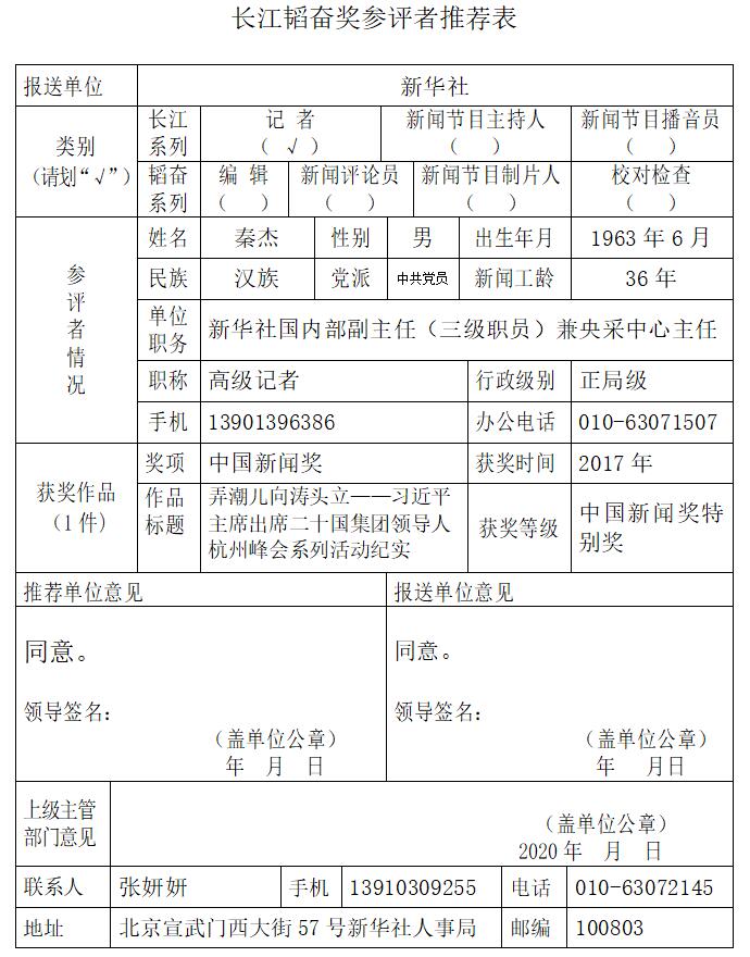 經(jīng)新華社編務(wù)會議投票表決并經(jīng)新華社黨組會議審議,確定秦杰同志為新華社推薦的第十六屆長江韜奮獎候選人。