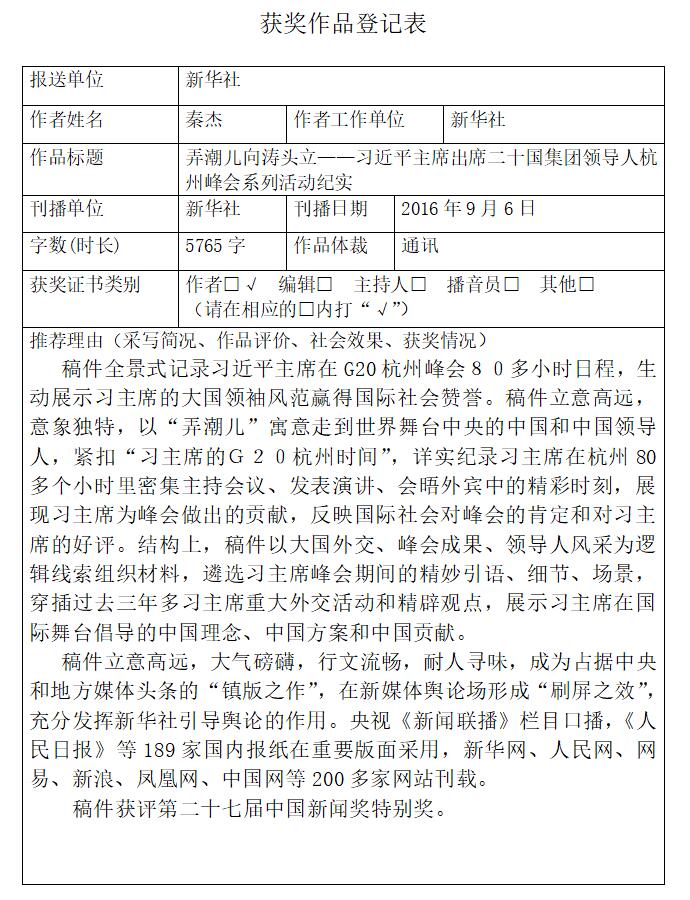 秦杰同志長期承擔(dān)中央主要領(lǐng)導(dǎo)同志的采訪報道任務(wù)。無論在條件艱苦的青藏高原,還是在行程萬里日程頻密的高訪之中,他都能不辭辛苦、日夜奮戰(zhàn),以高度的政治責(zé)任感和精益求精的職業(yè)精神出色完成任務(wù)。他參與采寫的《更高舉起改革開放偉大旗幟——寫在鄧小平同志誕辰110周年之際》和牽頭采寫的《弄潮兒向濤頭立——習(xí)近平主席出席二十國集團(tuán)領(lǐng)導(dǎo)人杭州峰會系列活動紀(jì)實》獲得中國新聞最高獎——中國新聞獎特別獎,參與撰寫的《中共高層新陣容》被譽(yù)為中國領(lǐng)導(dǎo)人對外報道的開創(chuàng)性作品并獲中國新聞獎一等獎。他采寫的《歷史見證承諾》《一枝一葉總關(guān)情》等報道成為時政報道領(lǐng)域不可多得的精品。