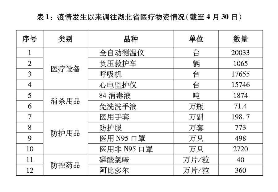 開展新中國成立以來規(guī)模最大的醫(yī)療支援行動。調(diào)動全國醫(yī)療資源和力量,全力支持湖北省和武漢市醫(yī)療救治。自1月24日除夕至3月8日,全國共調(diào)集346支國家醫(yī)療隊、4.26萬名醫(yī)務(wù)人員、900多名公共衛(wèi)生人員馳援湖北。19個省份以對口支援、以省包市的方式支援湖北省除武漢市以外16個地市,各省在發(fā)生疫情、防控救治任務(wù)十分繁重的情況下,集中優(yōu)質(zhì)醫(yī)療資源支援湖北省和武漢市。人民解放軍派出4000多名醫(yī)務(wù)人員支援湖北,承擔(dān)火神山醫(yī)院等3家醫(yī)療機(jī)構(gòu)的醫(yī)療救治任務(wù),空軍出動運(yùn)輸機(jī)緊急運(yùn)送醫(yī)療物資。各醫(yī)療隊從接受指令到組建2小時內(nèi)完成,24小時內(nèi)抵達(dá),并自帶7天防護(hù)物資,抵達(dá)后迅速開展救治。在全國緊急調(diào)配全自動測溫儀、負(fù)壓救護(hù)車、呼吸機(jī)、心電監(jiān)護(hù)儀等重點醫(yī)療物資支援湖北省和武漢市(表1)。從全國調(diào)集4萬名建設(shè)者和幾千臺機(jī)械設(shè)備,僅用10天建成有1000張病床的火神山醫(yī)院,僅用12天建成有1600張病床的雷神山醫(yī)院。短短10多天建成16座方艙醫(yī)院,共有1.4萬余張床位。加強(qiáng)臨床血液供應(yīng),10個省份無償支援湖北省紅細(xì)胞4.5萬單位,血小板1762個治療量,新鮮冰凍血漿137萬毫升(不含恢復(fù)期血漿)。大規(guī)模、強(qiáng)有力的醫(yī)療支援行動,有力保障了湖北省和武漢市救治,極大緩解了重災(zāi)區(qū)醫(yī)療資源嚴(yán)重不足的壓力。