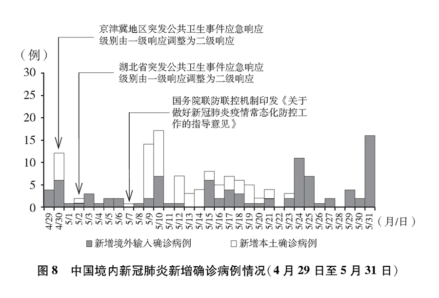 境內(nèi)疫情總體呈零星散發(fā)狀態(tài),局部地區(qū)出現(xiàn)散發(fā)病例引起的聚集性疫情,境外輸入病例基本得到控制,疫情積極向好態(tài)勢持續(xù)鞏固,全國疫情防控進(jìn)入常態(tài)化。加大力度推進(jìn)復(fù)工復(fù)產(chǎn)復(fù)學(xué),常態(tài)化防控措施經(jīng)受“五一”假期考驗。經(jīng)中共中央批準(zhǔn),國務(wù)院聯(lián)防聯(lián)控機(jī)制派出聯(lián)絡(luò)組,繼續(xù)加強(qiáng)湖北省疫情防控。(圖8)