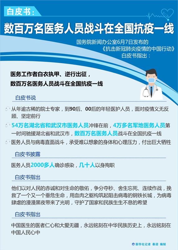 新華社北京6月7日電(記者田曉航)國務(wù)院新聞辦公室7日發(fā)布的《抗擊新冠肺炎疫情的中國行動(dòng)》白皮書指出,醫(yī)務(wù)工作者白衣執(zhí)甲、逆行出征,數(shù)百萬名醫(yī)務(wù)人員戰(zhàn)斗在全國抗疫一線。