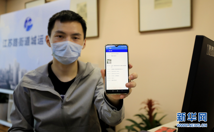 6月8日,在上海江蘇路街道城運(yùn)中心,工作人員展示手機(jī)上收到的路面垃圾暴露待處理報(bào)警信息。 新華社記者 方喆攝