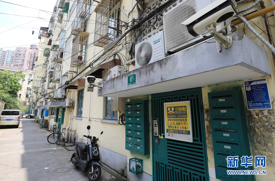 這是上海江蘇路街道一居民樓單元門上安裝的與上海江蘇路街道城運(yùn)中心聯(lián)網(wǎng)的攝像設(shè)備(6月8日攝)。新華社記者 方喆攝