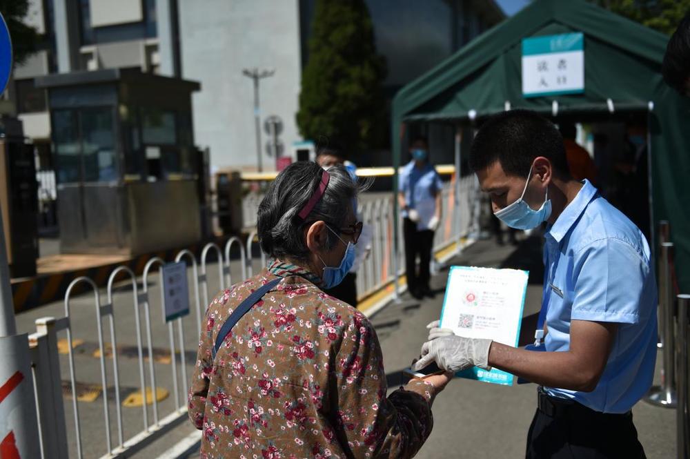 5月12日,在國家圖書館入口處,工作人員引導(dǎo)讀者掃描健康碼。新華社發(fā)(陳鐘昊 攝)