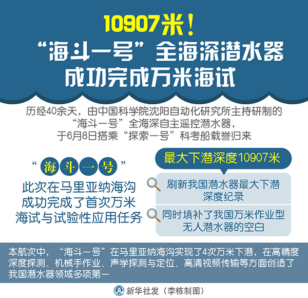 “海斗一號”此次在馬里亞納海溝成功完成了首次萬米海試與試驗性應用任務,最大下潛深度10907米,刷新我國潛水器最大下潛深度紀錄,同時填補了我國萬米作業(yè)型無人潛水器的空白。