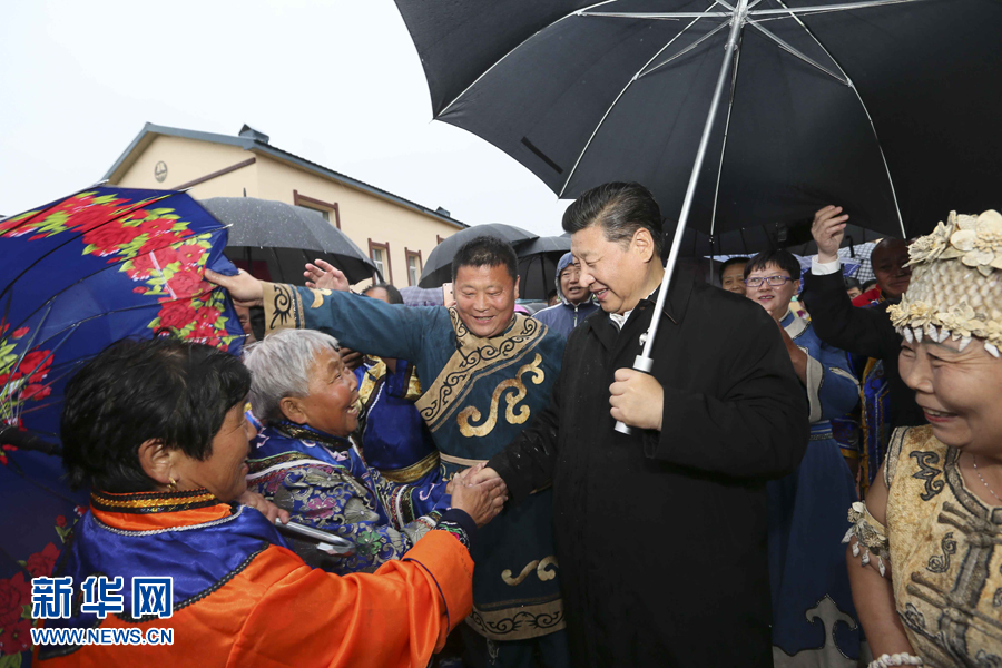 2014年春節(jié)前夕,習(xí)近平來到內(nèi)蒙古,看望慰問各族干部群眾。他來到錫林浩特市寶力根蘇木(鄉(xiāng))冬季那達(dá)慕,同牧民們一起觀摔跤,看賽馬,聽長(zhǎng)調(diào),賞歌舞。在傳統(tǒng)的“五畜祈?!眱x式上,他按照蒙古族習(xí)俗,用無名指蘸上銀碗盛著的鮮牛奶彈了三下,祝福來年風(fēng)調(diào)雨順,五畜興旺,人民幸福安康。