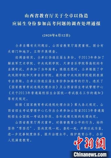 經(jīng)調(diào)查核實(shí),仝卓以偽造應(yīng)屆生身份,于2013年參加解放軍藝術(shù)學(xué)院、中央戲劇學(xué)院、天津音樂(lè)學(xué)院等高校的專業(yè)課考試,并參加當(dāng)年高考,被中央戲劇學(xué)院歌劇表演專業(yè)錄取。依據(jù)《國(guó)家教育考試違規(guī)處理辦法》第九條之規(guī)定,山西省招生考試管理中心作出仝卓參加山西省2013年普通高校招生全國(guó)統(tǒng)一考試各階段、各科成績(jī)無(wú)效的處理決定。