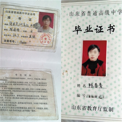 5月26日,山東理工大學(xué)招生處工作人員向陳春秀證實,她的學(xué)籍被同縣考生陳雙雙頂替使用。