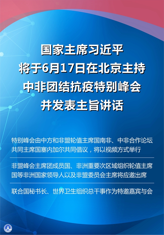 特別峰會(huì)由中方和非盟輪值主席國(guó)南非、中非合作論壇共同主席國(guó)塞內(nèi)加爾共同倡議,將以視頻方式舉行。非盟峰會(huì)主席團(tuán)成員國(guó)、非洲重要次區(qū)域組織輪值主席國(guó)等非洲國(guó)家領(lǐng)導(dǎo)人以及非盟委員會(huì)主席將應(yīng)邀出席。聯(lián)合國(guó)秘書長(zhǎng)、世界衛(wèi)生組織總干事作為特邀嘉賓與會(huì)。