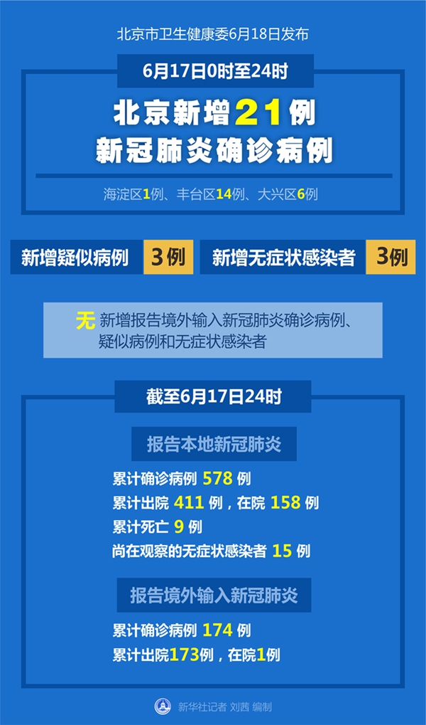 新華社北京6月18日電(記者俠克)北京市衛(wèi)生健康委18日通報(bào),17日0時(shí)至24時(shí),北京市新增報(bào)告本地新冠肺炎確診病例21例、疑似病例3例、無癥狀感染者3例;無新增報(bào)告境外輸入新冠肺炎確診病例、疑似病例和無癥狀感染者。