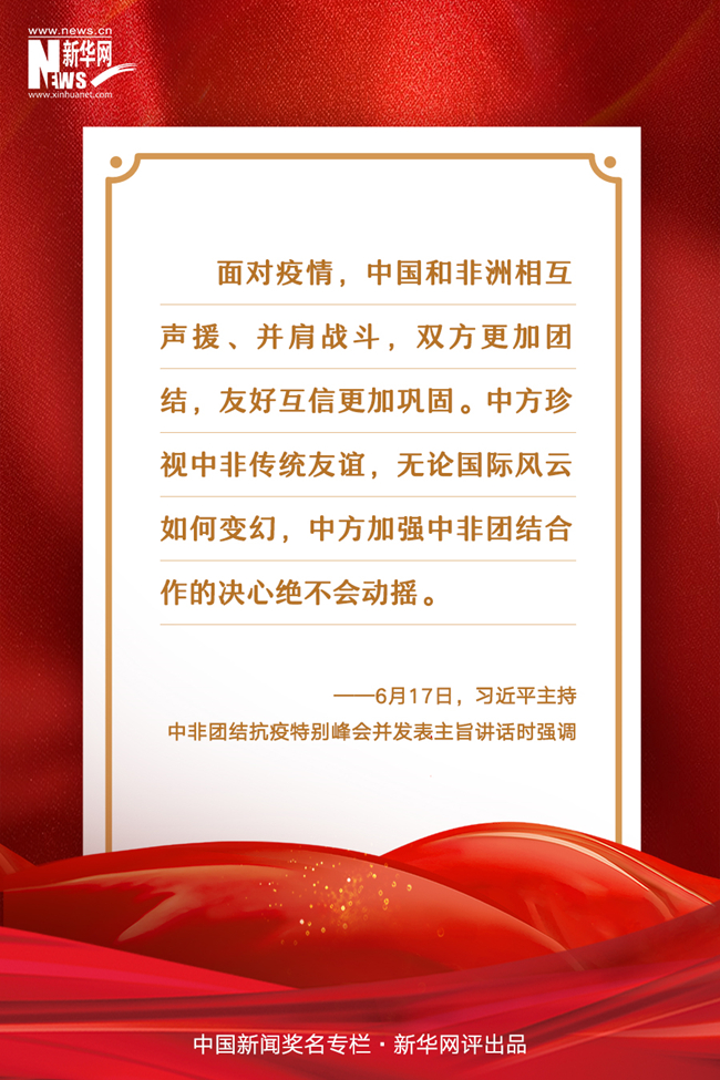 新老朋友通過視頻相聚,共商團結(jié)抗疫大計,共敘中非兄弟情誼。6月17日,由中國和非洲聯(lián)盟輪值主席國南非、中非合作論壇共同主席國塞內(nèi)加爾共同發(fā)起的中非團結(jié)抗疫特別峰會舉行。國家主席習(xí)近平在北京主持了這一峰會,并發(fā)表題為《團結(jié)抗疫 共克時艱》的主旨講話,強調(diào)中非要堅定不移攜手抗擊疫情、推進(jìn)中非合作、踐行多邊主義、推進(jìn)中非友好,共同打造中非衛(wèi)生健康共同體,推進(jìn)中非全面戰(zhàn)略合作伙伴關(guān)系高水平發(fā)展。