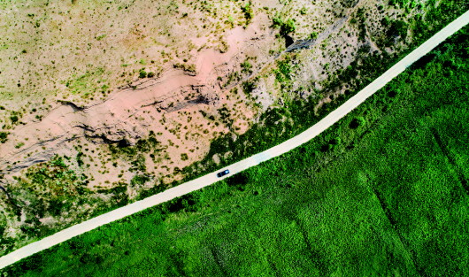 一輛汽車行駛在榆林市橫山區(qū)沙漠治理與未治理的分界公路上(2018年8月4日無人機拍攝)。