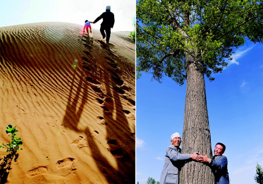 拼版照片左圖:1998年8月,榆林市靖邊縣郭成旺老人帶著曾孫行進在沙漠中。老人的希望是:子子孫孫植樹造林,直到沙漠都變成綠洲;右圖:2020年5月22日,99歲的郭成旺老人(左)與孫兒郭建軍抱著當年栽下的第一棵楊樹,向參觀者介紹當年植樹的情景。本報記者陶明攝