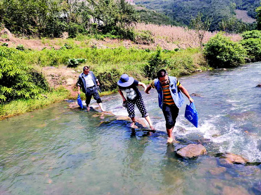納雍縣鍋圈巖鄉(xiāng)土補(bǔ)村扶貧特崗張龍(右)與張迪(中)等蹚水過(guò)河走訪貧困戶。組圖均由受訪者提供(手機(jī)拍攝)