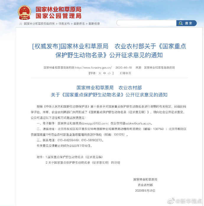 這些調(diào)整你同意嗎?公眾可通過以下途徑和方式提出反饋意見:一、電子郵件:國家林業(yè)和草原局dzwszgc@163.com;農(nóng)業(yè)農(nóng)村部ssbkw@cafs.ac.cn。二、通信地址:北京市東城區(qū)和平里東街18號(hào)國家林業(yè)和草原局動(dòng)植物司資規(guī)處(郵編:100714);北京市朝陽區(qū)農(nóng)展館南里11號(hào)農(nóng)業(yè)農(nóng)村部漁業(yè)漁政管理局資源環(huán)保處(郵編:100125)。三、聯(lián)系電話:010-84238449;010-59193273。有關(guān)意見反饋截止時(shí)間為2020年7月19日。(記者胡璐)