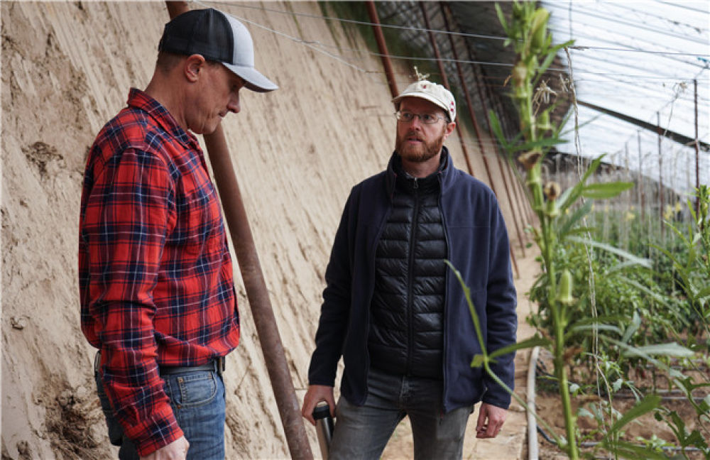 摩根(左)和丹尼爾在西寧市總寨塬高原型現(xiàn)代都市農(nóng)業(yè)科技示范園的蔬菜大棚內(nèi)聊天(2019年11月12日攝)。新華社記者 吳剛 攝