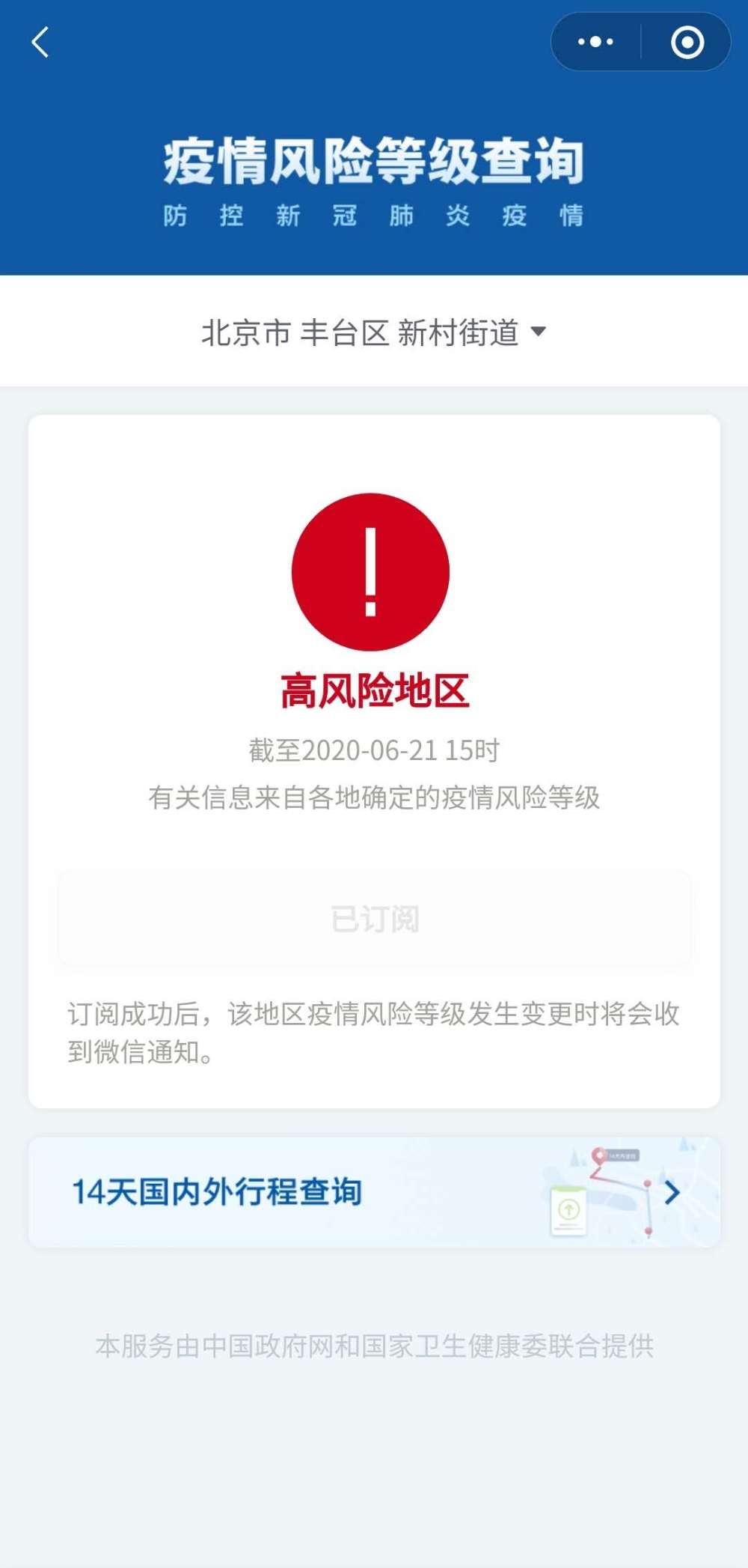 記者從國(guó)務(wù)院客戶端小程序“疫情風(fēng)險(xiǎn)等級(jí)查詢”上了解到,截至6月21日15時(shí),北京市豐臺(tái)區(qū)新村街道、大興區(qū)黃村(地區(qū))鎮(zhèn)由中風(fēng)險(xiǎn)調(diào)整為高風(fēng)險(xiǎn)。北京市豐臺(tái)區(qū)長(zhǎng)辛店街道、右安門街道,大興區(qū)安定鎮(zhèn),海淀區(qū)八里莊街道,通州區(qū)北苑街道由低風(fēng)險(xiǎn)調(diào)整為中風(fēng)險(xiǎn)。