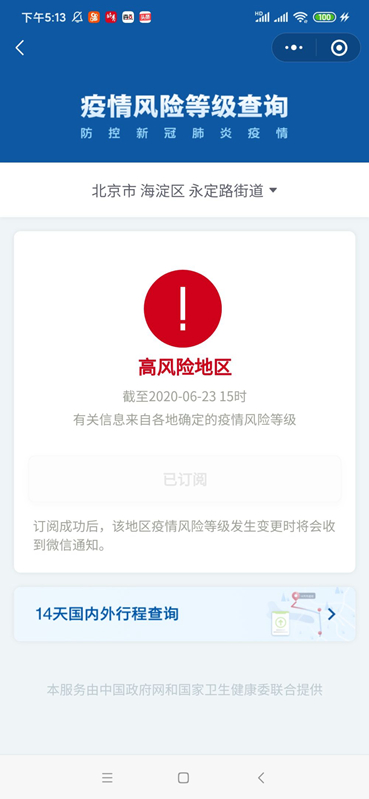 北京又增一個(gè)高風(fēng)險(xiǎn)地區(qū)! 記者從國務(wù)院客戶端小程序“疫情風(fēng)險(xiǎn)等級(jí)查詢”上了解到,截至6月23日15時(shí),北京市海淀區(qū)永定路街道由中風(fēng)險(xiǎn)調(diào)整為高風(fēng)險(xiǎn)。