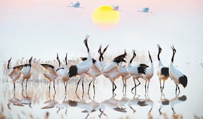 鹽城國家級珍禽自然保護(hù)區(qū)里的丹頂鶴。孫華金攝