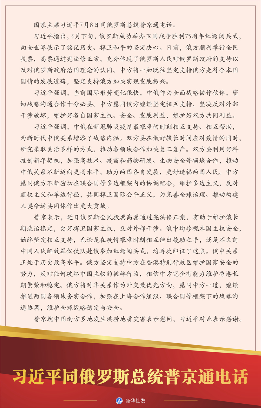 習(xí)近平指出,6月下旬,俄羅斯成功舉辦衛(wèi)國戰(zhàn)爭(zhēng)勝利75周年紅場(chǎng)閱兵式,向全世界展示了銘記歷史、捍衛(wèi)和平的堅(jiān)定決心。日前,俄方順利舉行全民投票,高票通過憲法修正案,充分體現(xiàn)了俄羅斯人民對(duì)俄羅斯政府的支持以及對(duì)俄羅斯政府治國理念的認(rèn)同。中方將一如既往堅(jiān)定支持俄方走符合本國國情的發(fā)展道路,堅(jiān)定支持俄方加快實(shí)現(xiàn)發(fā)展振興。