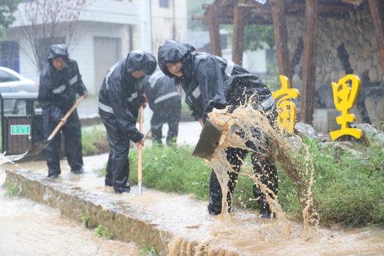 2020年7月6日,浙江省湖州市德清縣武康街道對河口村,青年黨員搶險(xiǎn)救援隊(duì)隊(duì)員正在用鐵鍬排水。人民圖片 王正/攝