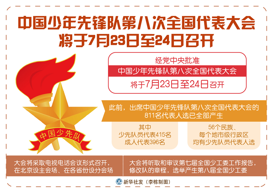 新華社北京7月20日電(記者王鵬)經(jīng)黨中央批準(zhǔn),中國少年先鋒隊(duì)第八次全國代表大會(huì)將于7月23日至24日召開。目前,大會(huì)的各項(xiàng)籌備工作進(jìn)展順利。