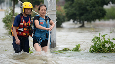 7月14日,鄭國花(左)用繩子拉著鄭龍進行訓(xùn)練。新華社記者 連振 攝